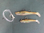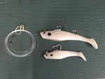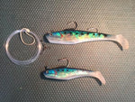 Tsunami Tandems - a great alternative for Spring and Fall trolling on the Bay. Tsunami's holographic swim shad have tremendous action as a trolled lure. Set them up as tandems as you're chances are even better. We rig them with a three way swivel and 80 pound test line - all crimped. Easy to care for, easy to store and pretty much immune to jelly fish slime.