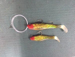 Large Tsunami Tandem built with Holographic 9" Dual Hook swim shad, 3 way swivel, 7" Holographic swim shad built on 80# mono.