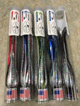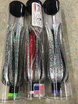 The Outlaw Jr. features a unique “belly- weighted” custom painted lead head with sparkling prismatic 3D eyes. Its true secret is that it always runs upright and straight no matter how it is rigged. When used over a ballyhoo, the reverse tied brilliant flashing skirt material undulates seductively as the lure is pulled through the waves. The Outlaw catches everything that swims includingKing Mackerel, Wahoo, Tuna, Dolphin as well as billfish.