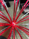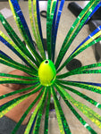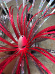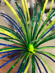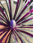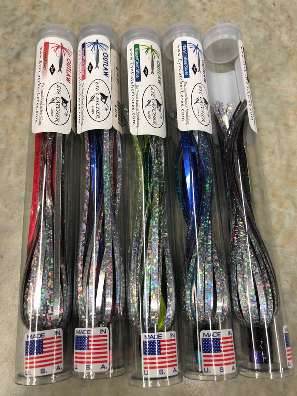 The Outlaw. After all these years this is still my number one selling lure. The Outlaw & Outlaw Jr. both feature a unique “belly- weighted” custom painted lead head with sparkling prismatic 3D eyes. Its true secret is that it always runs upright and straight no matter how it is rigged. When used over a ballyhoo, the reverse tied brilliant flashing skirt material undulates seductively as the lure is pulled through the waves. The Outlaw catches everything that swims including King Mackerel, Wahoo, Tuna, Dolphin as well as Billfish.