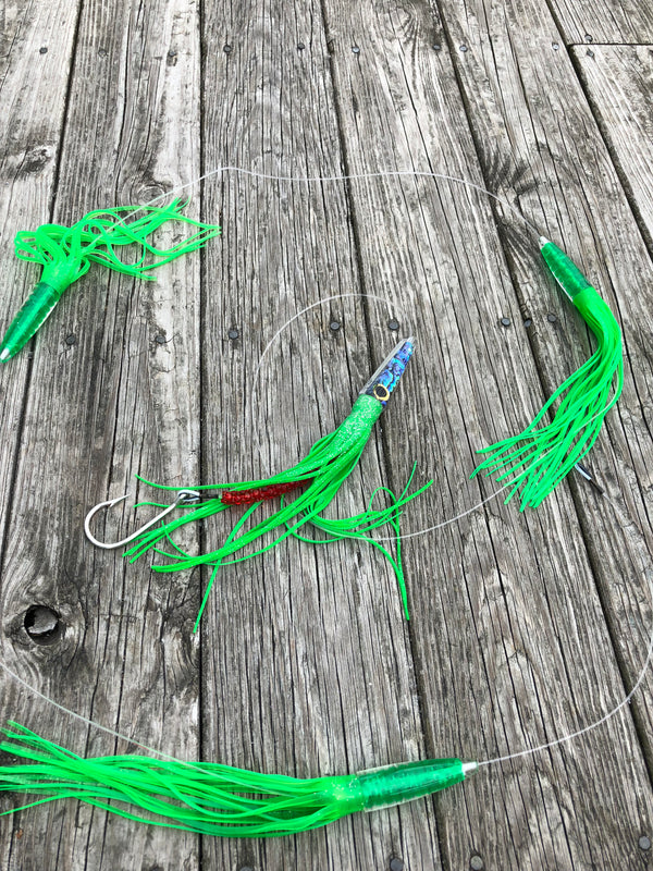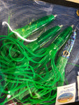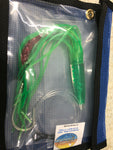 Rigged green machine. Small built on Billfisher 130# leader with a 7/0 Mustad 7691 DT hook. Large built on 130# Billfisher Leader with Mustad 8/0 7691 DT hook. Large Green Machine Teaser built on 130# Billfisher Leader with Mustad 9/0 7691 DT hook with a speed machine.